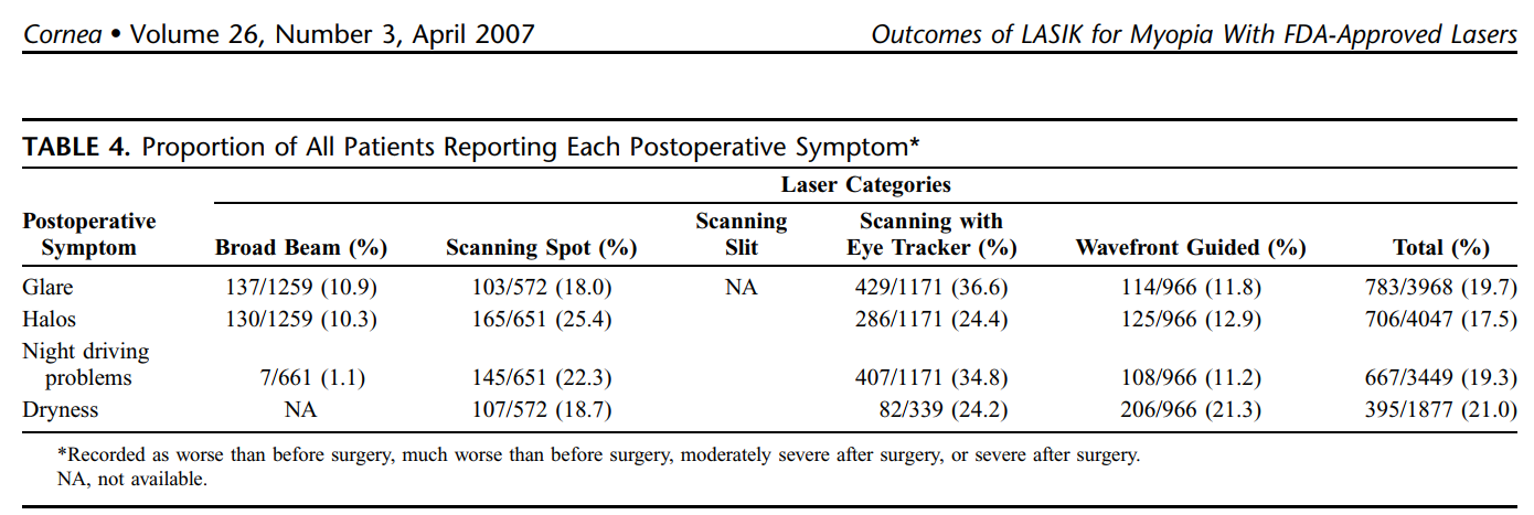Source: Bailey MD, Zadnik K. Outcomes of LASIK for myopia with FDA-approved lasers. Cornea 2007 Apr;26(3):246-54.